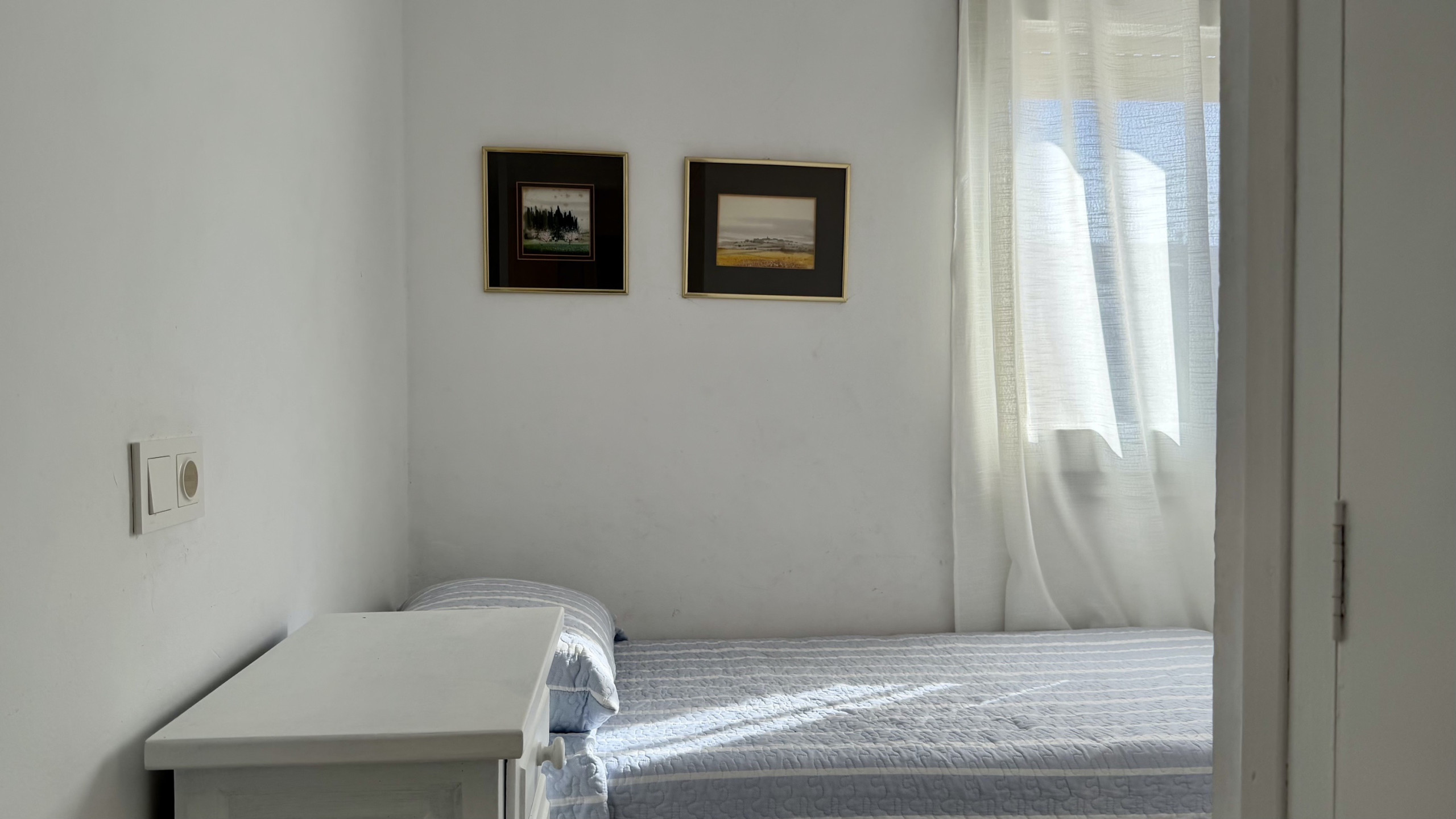 El apartamento cuenta con 3 dormitorios bien distribuidos: un dormitorio con cama matrimonial y dos dormitorios con camas individuales, garantizando un descanso cómodo para todos los huéspedes. Dispone de un completo baño con bañera, perfecto para relajarse después de un día de playa.