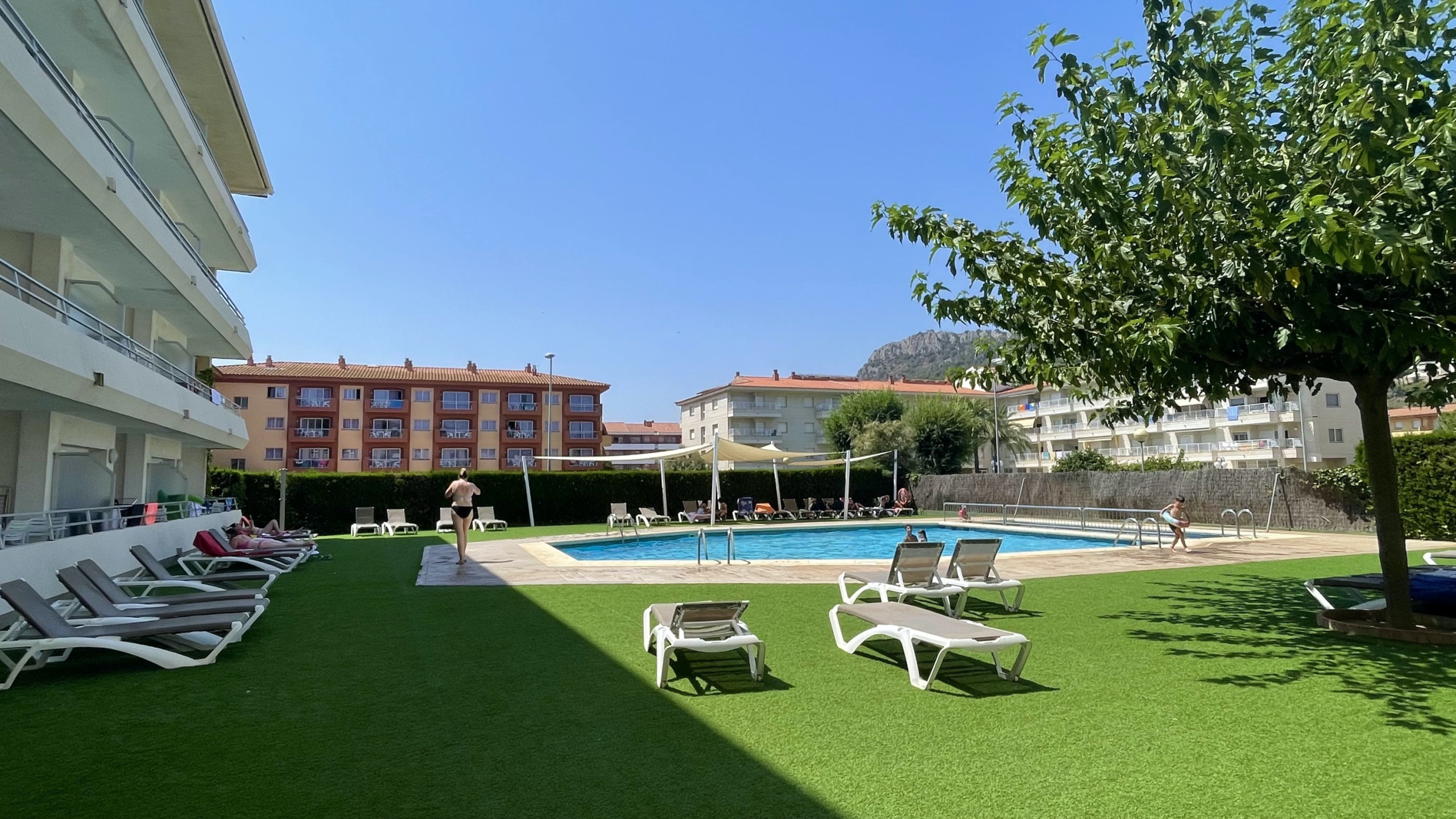 El apartamento tiene una gran terraza con una inmejorable vista del todo el complejo Rocamaura, con la piscina a tus pies y las Islas Medes de fondo.