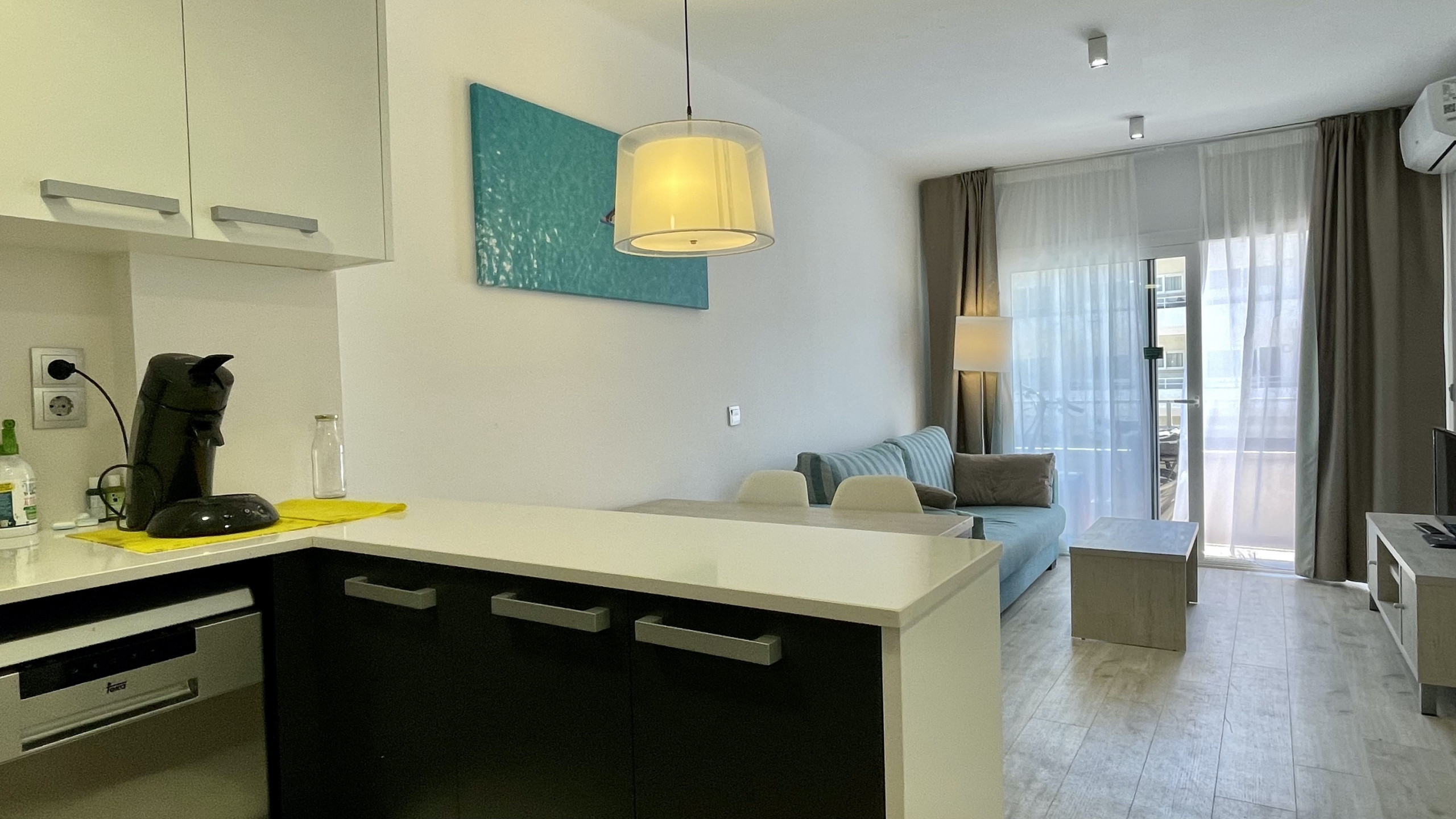 La cocina americana, equipada con sistema de cocción de vitrocerámica, está completamente equipada con los electrodomésticos esenciales, como frigorífico, microondas, congelador, lavavajillas, además de vajilla, cubertería, utensilios de cocina, cafetera y tostadora.