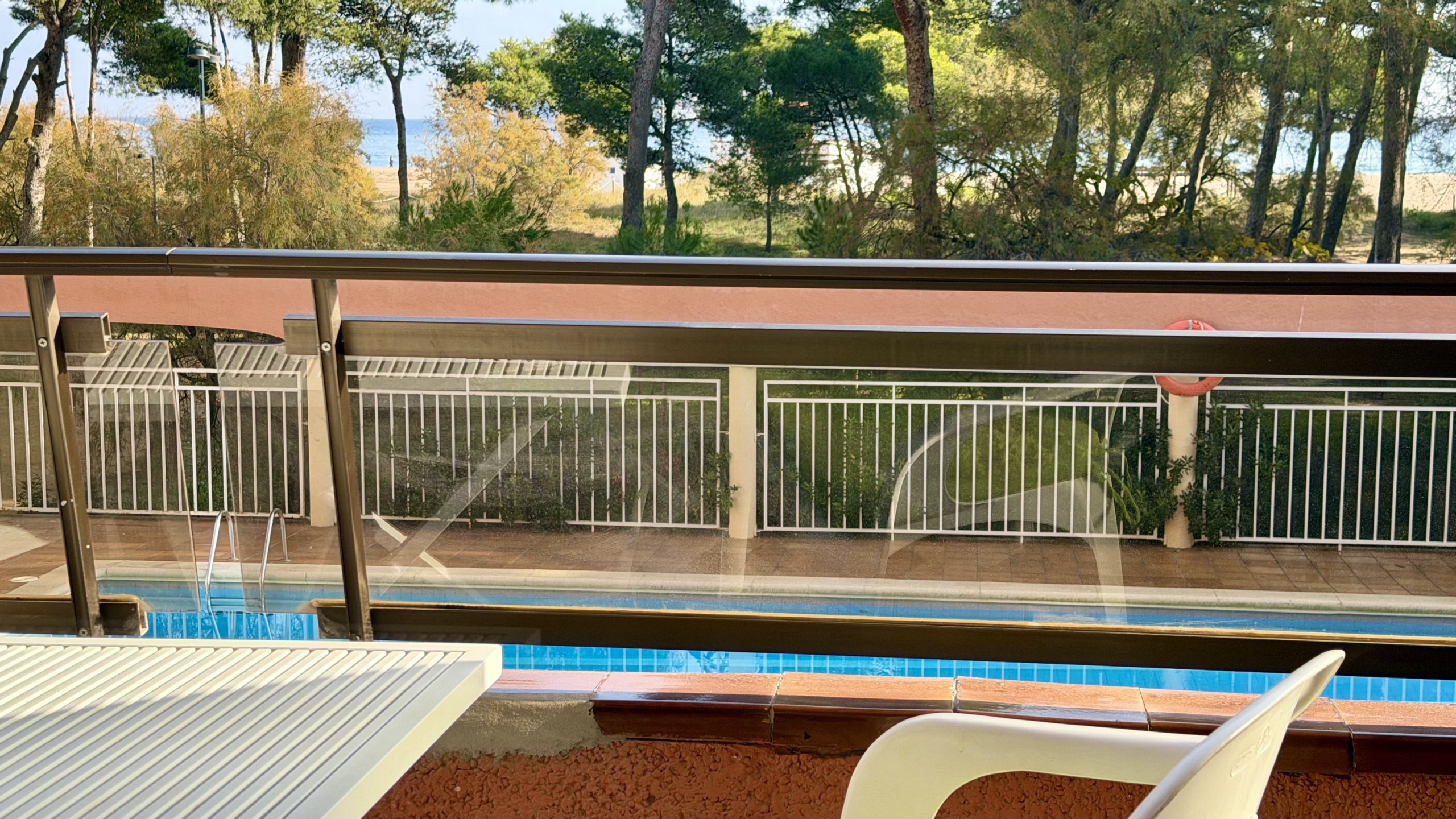 El apartamento tiene una gran terraza con una inmejorable vista del todo el complejo Rocamaura, con la piscina a tus pies y las Islas Medes de fondo.