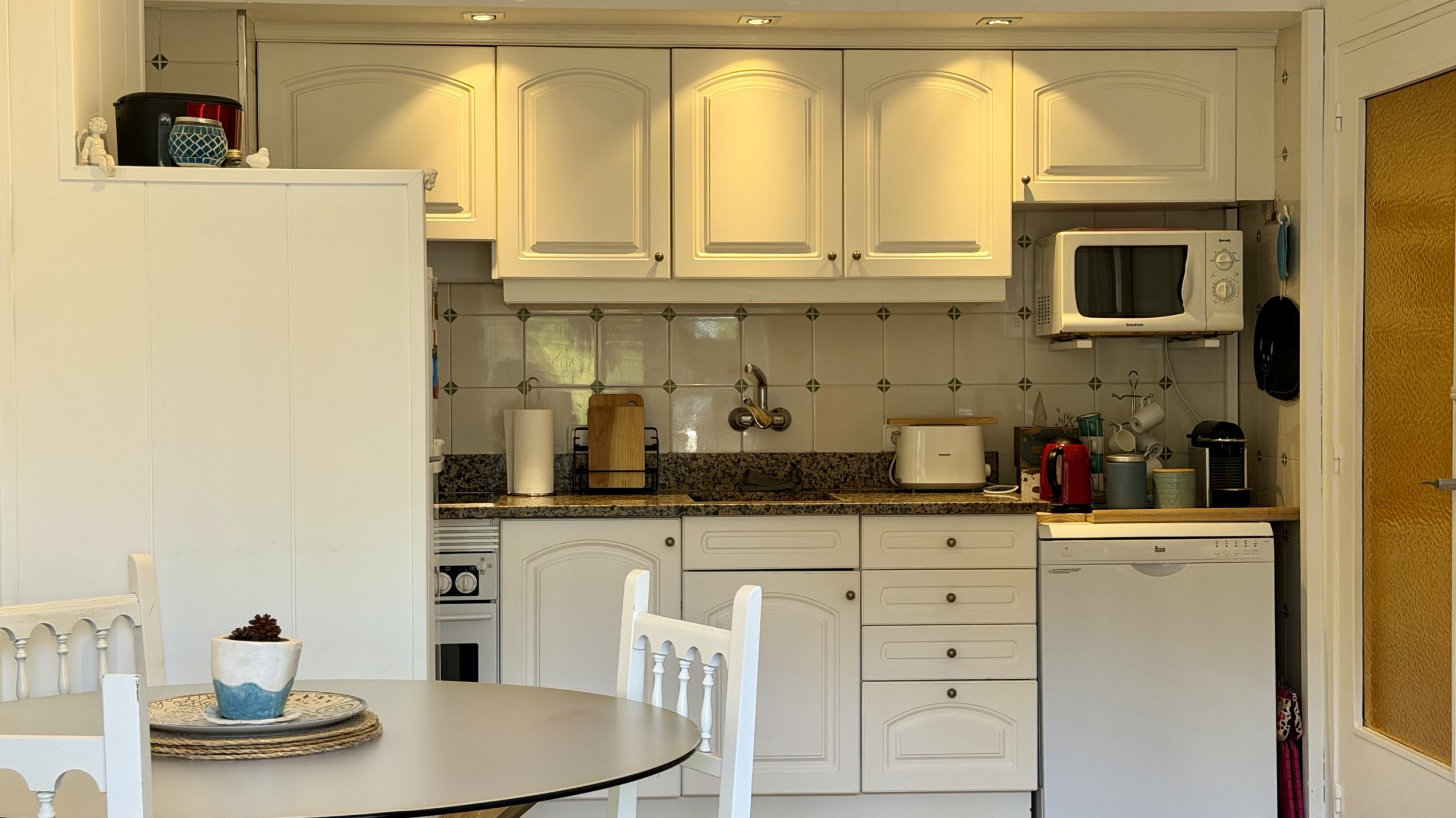 En su interior, encontrarás un dormitorio con una cama doble y un sofá cama adicional, lo que ofrece flexibilidad para diferentes configuraciones de descanso. La cocina americana está completamente equipada con electrodomésticos modernos como nevera, horno, microondas, lavavajillas y máquina de café, permitiéndote preparar deliciosas comidas.