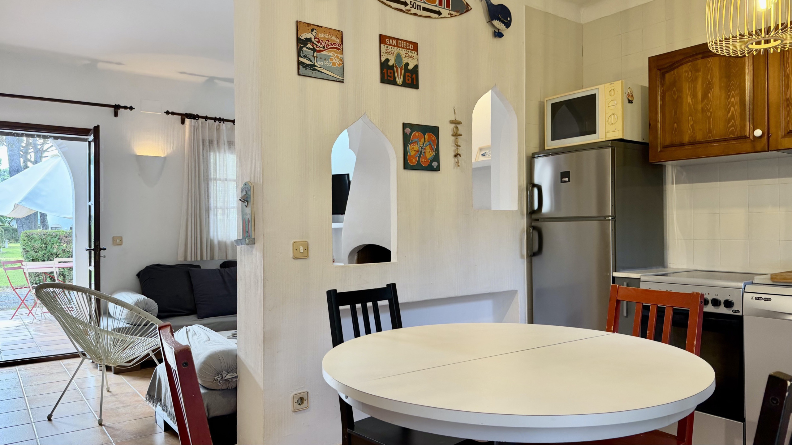 La cocina americana está completamente equipada con electrodomésticos modernos como lavadora, lavavajillas, horno, microondas, tostadora y máquina de café. Además, cuenta con chimenea para crear momentos únicos en las noches más frescas.