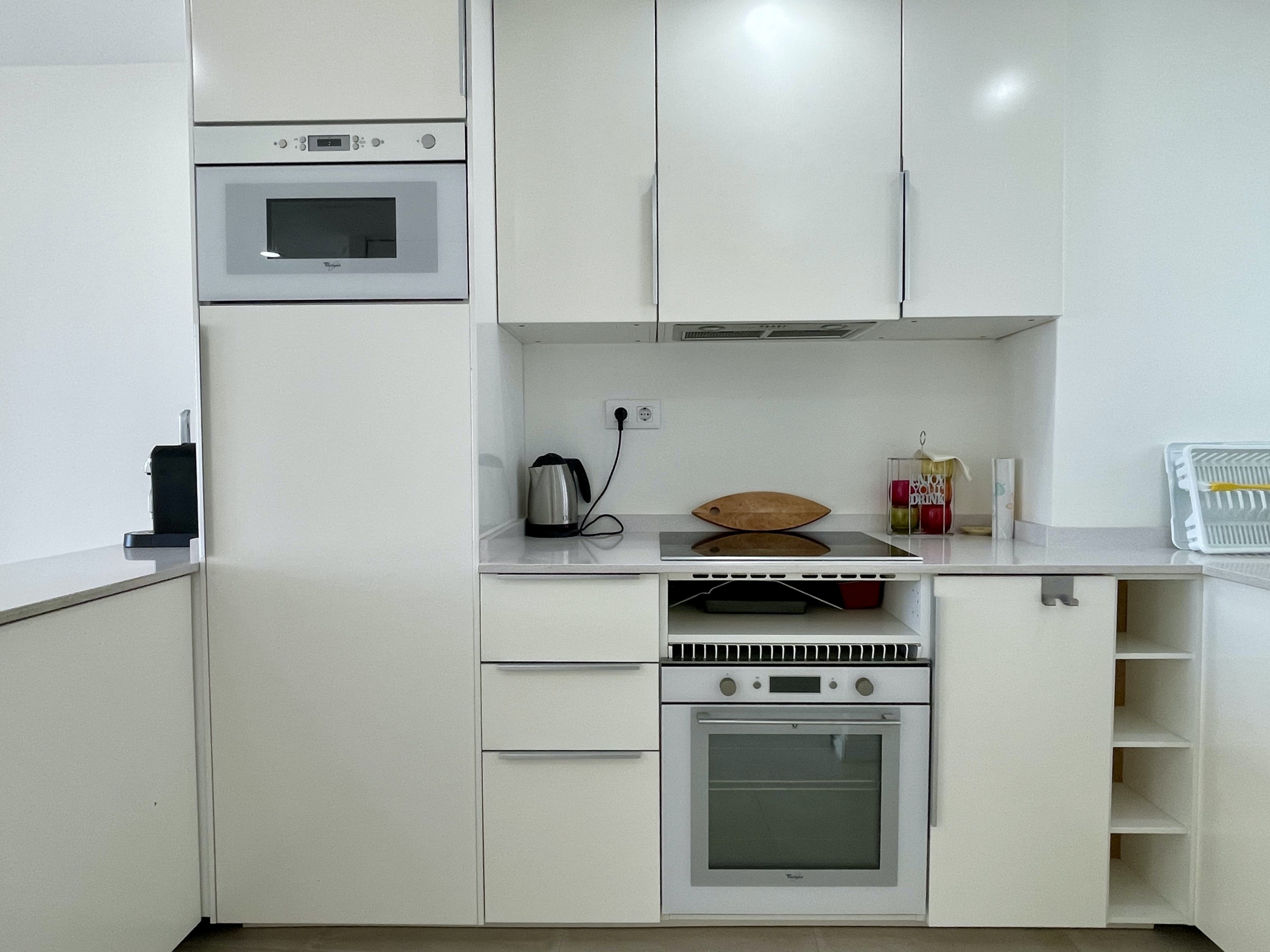 La cuina americana de ceràmica està totalment equipada amb nevera, microones, forn, congelador, renta vaixelles, , estris de cuina, cafeteria i torradora.