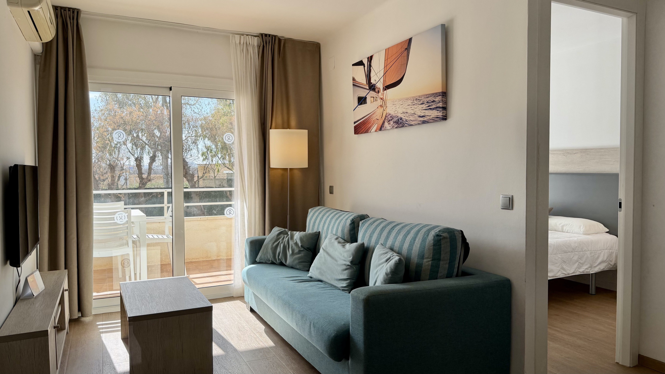 L'apartament té una gran terrassa amb una vista immillorable de tot el complex Rocamaura, amb la piscina als teus peus i les Illes Medes de fons.