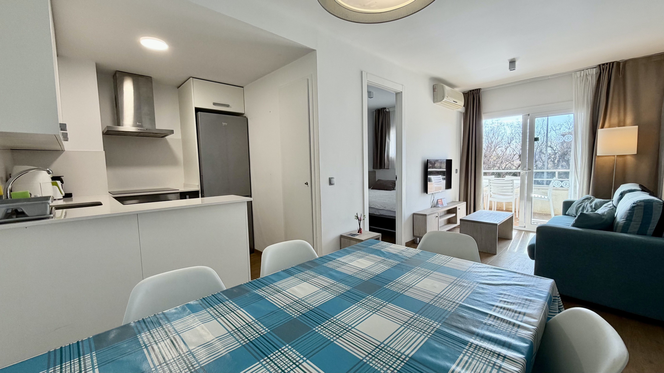 L'apartament disposa d'una cuina americana completament equipada, ideal per preparar àpats en família. Compta amb electrodomèstics moderns com nevera, congelador, rentadora, rentaplats, forn, fregidora, torradora i cafetera. La zona de cuina està dissenyada per facilitar la preparació de menjars i compartir moments junts.