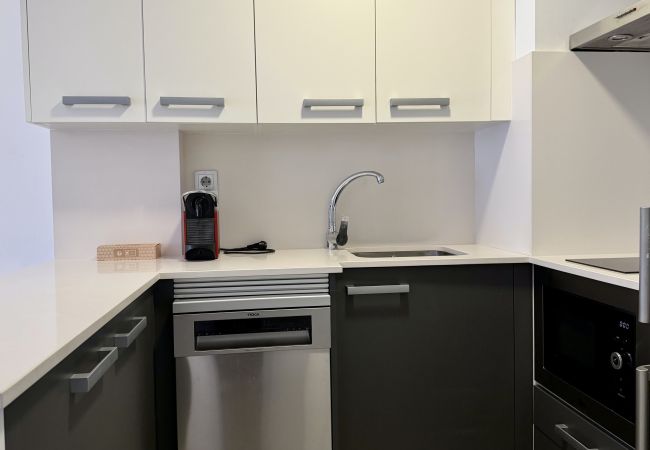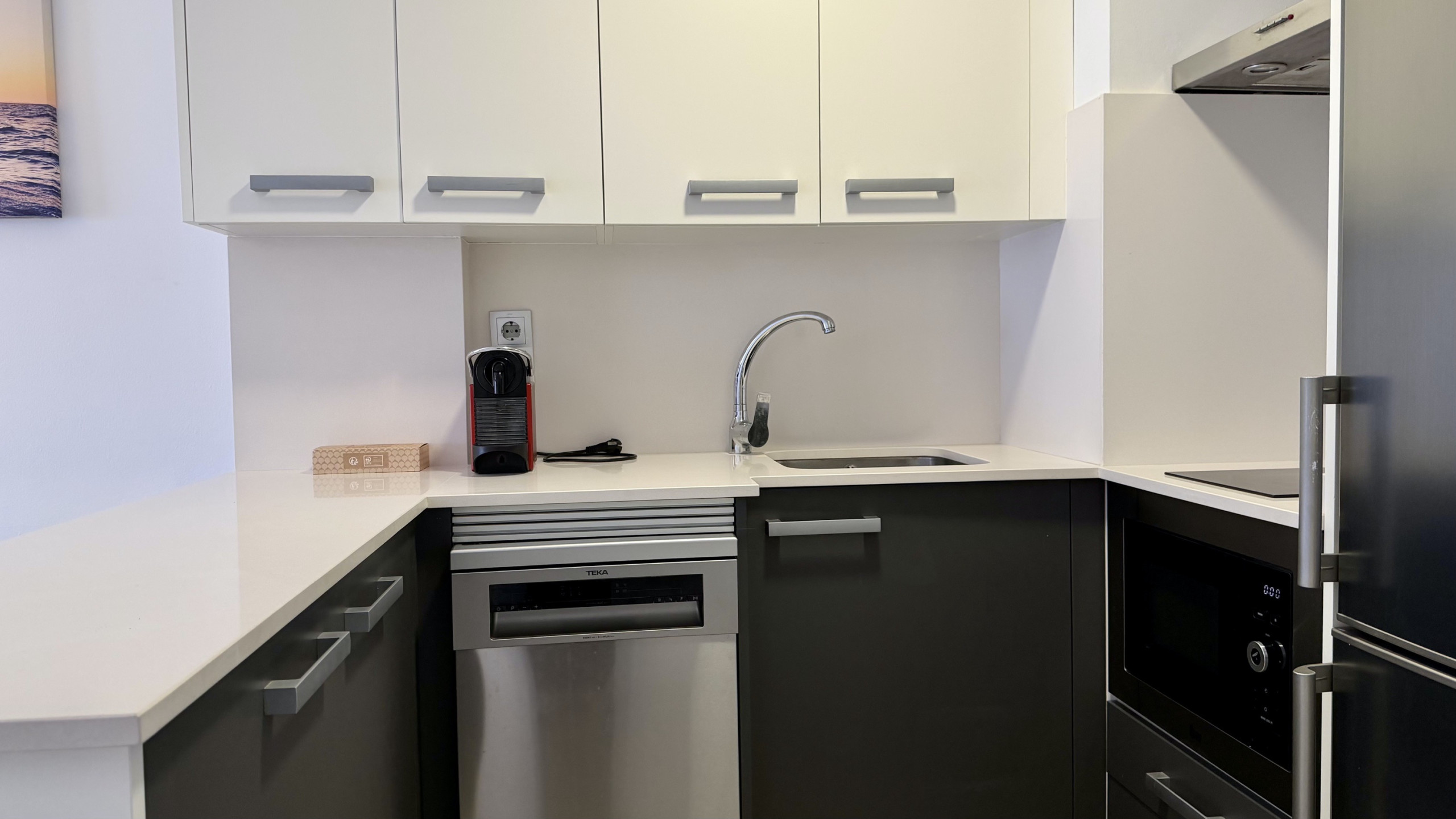 La cuina americana està completament equipada amb electrodomèstics moderns com nevera, rentadora, forn, microones, cafetera i torradora. Podràs preparar deliciosos àpats i gaudir de moments íntims en aquest espai.