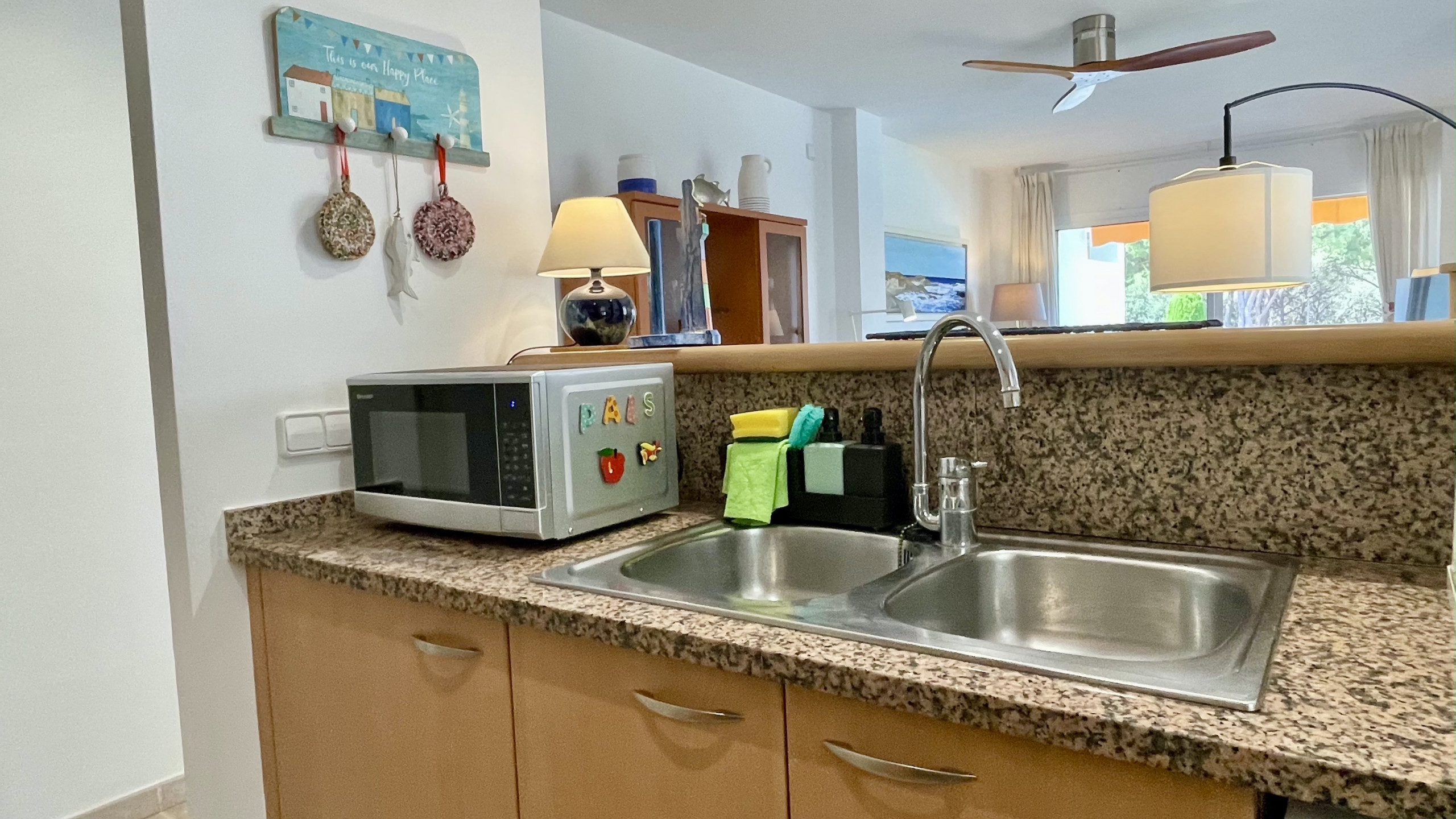 Situat prop de la platja de sorra i del camp de golf, aquest apartament ofereix un entorn tranquil i familiar. A més, està convenientment situat a poca distància del supermercat.