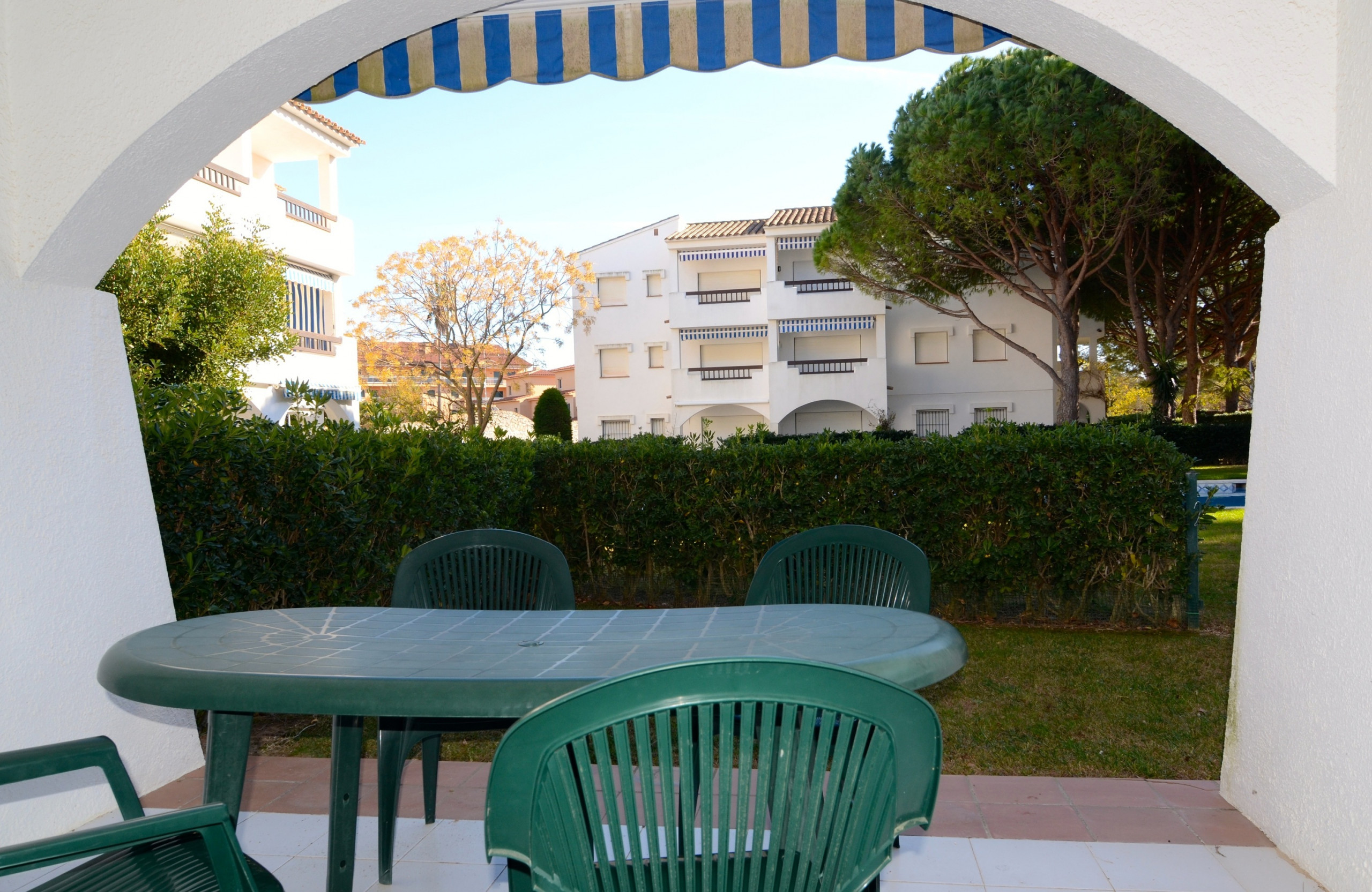 Aquest apartament a la planta baixa té un gran jardí privat amb accés directe a la zona de la piscina comunitària. Té barbacoa, hamaques i una taula per menjar a l'aire lliure.