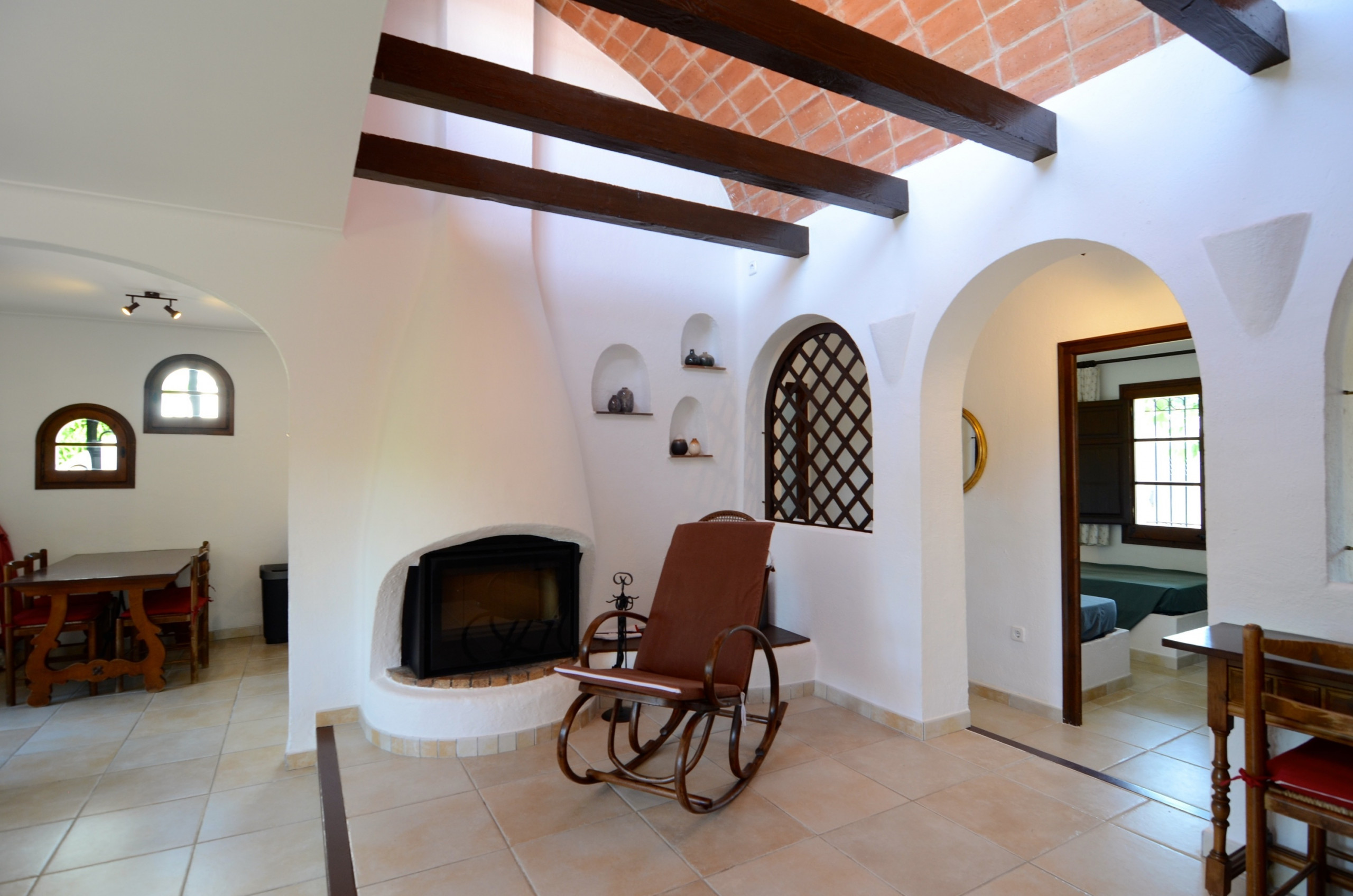 Dieses charmante Haus im Ibiza-Stil bietet einen komfortablen und entspannten Aufenthalt, ideal für einen Familienurlaub. Mit einem ebenerdigen Design verfügt das Haus über ein geräumiges Wohnzimmer mit Kamin, einen voll ausgestatteten Küchen-Essbereich, drei Doppelschlafzimmer, ein Badezimmer und eine Toilette.
