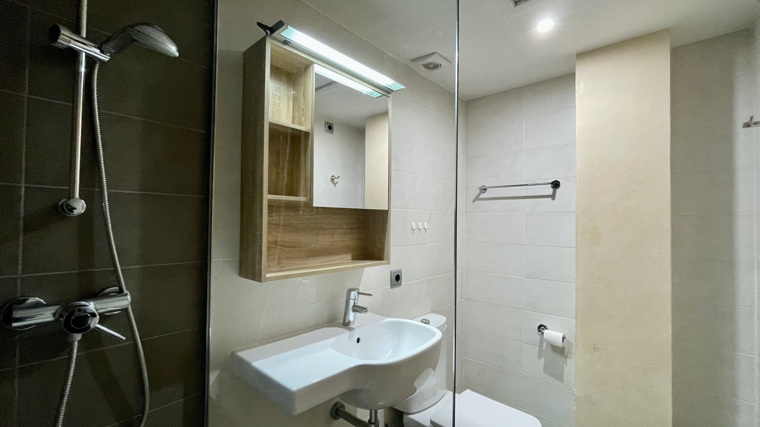 Die Wohnung verfügt über einen gemeinsamen Pool, der ideal ist, damit Kinder spielen und Erwachsene sich entspannen können. Sie verfügt über zwei Badezimmer, eines mit Dusche und eines mit Badewanne, was die Familienroutine erleichtert.