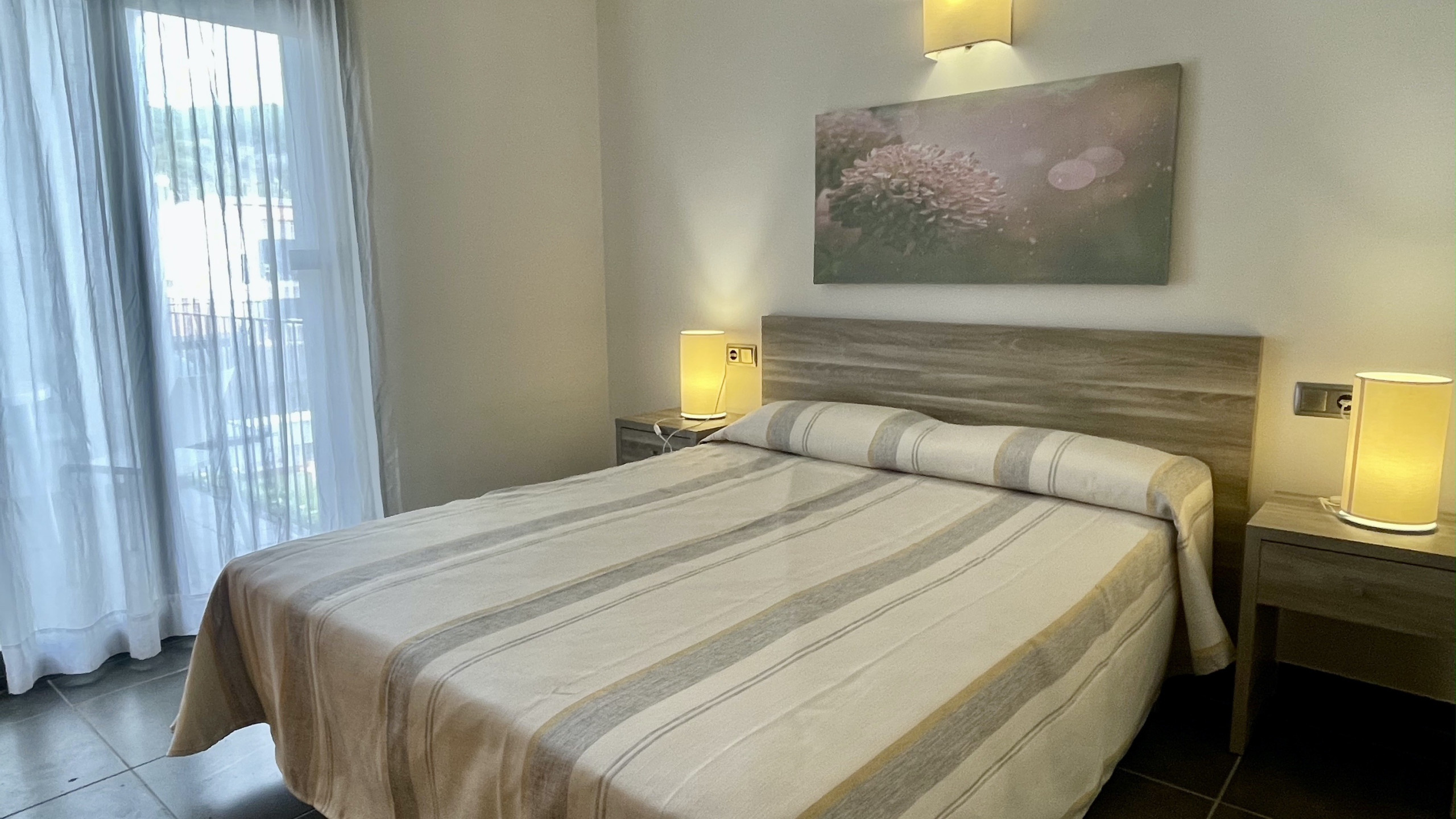 Die Wohnung verfügt über zwei gut verteilte Schlafzimmer: ein Hauptschlafzimmer mit Doppelbett und ein weiteres mit zwei Einzelbetten, zusätzlich zu einer Schlafcouch, die mehr Personen beherbergen kann. Der Gemeinschaftsbereich ist geräumig und hell, mit einer voll ausgestatteten amerikanischen Küche, die die Zubereitung von Familienmahlzeiten erleichtern wird.