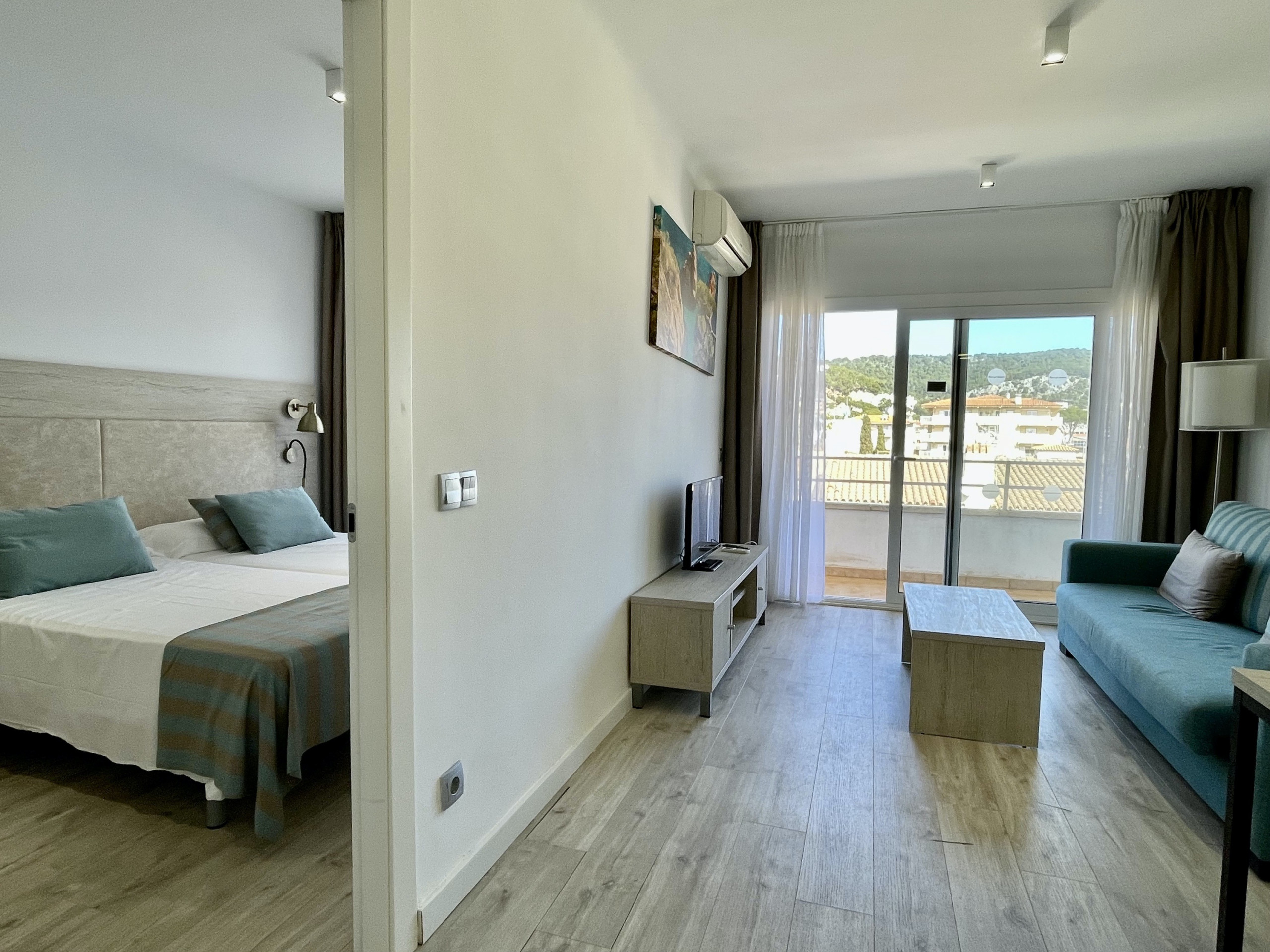 In der Anlage Rocamaura steht diese Ein-Zimmer-Wohnung für Ferienvermietung zur Verfügung. Sie verfügt über ein Doppelstockbett und ein Einzelbett und bietet Platz für bis zu 3 Personen. Die Wohnung umfasst ein Wohn-Esszimmer mit Sofa und Fernseher, eine kleine separate Küche und ein Badezimmer mit Dusche.