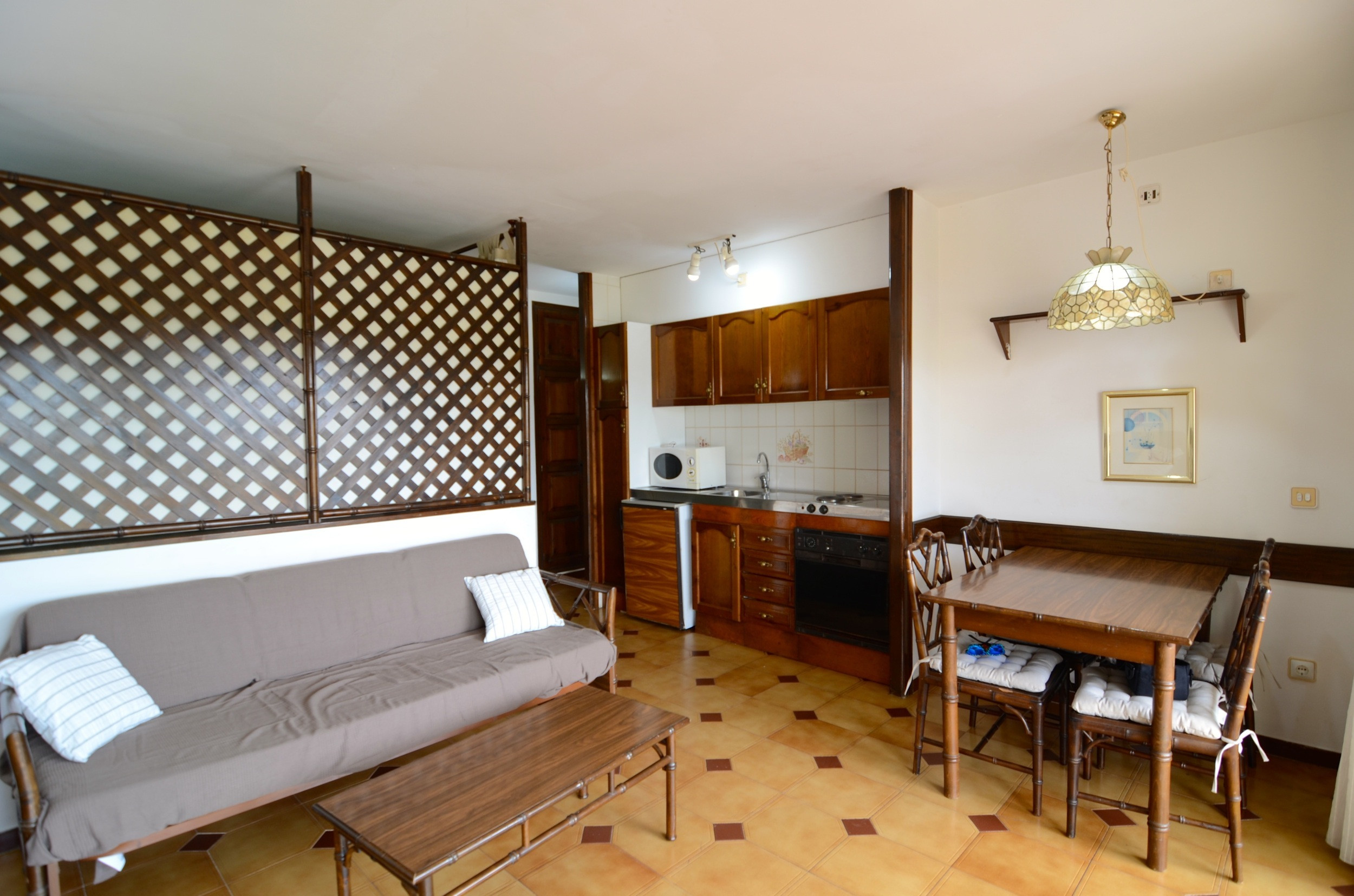 In der Anlage Rocamaura steht diese Ein-Zimmer-Wohnung für Ferienvermietung zur Verfügung. Sie verfügt über ein Doppelstockbett und ein Einzelbett und bietet Platz für bis zu 3 Personen. Die Wohnung umfasst ein Wohn-Esszimmer mit Sofa und Fernseher, eine kleine separate Küche und ein Badezimmer mit Dusche.