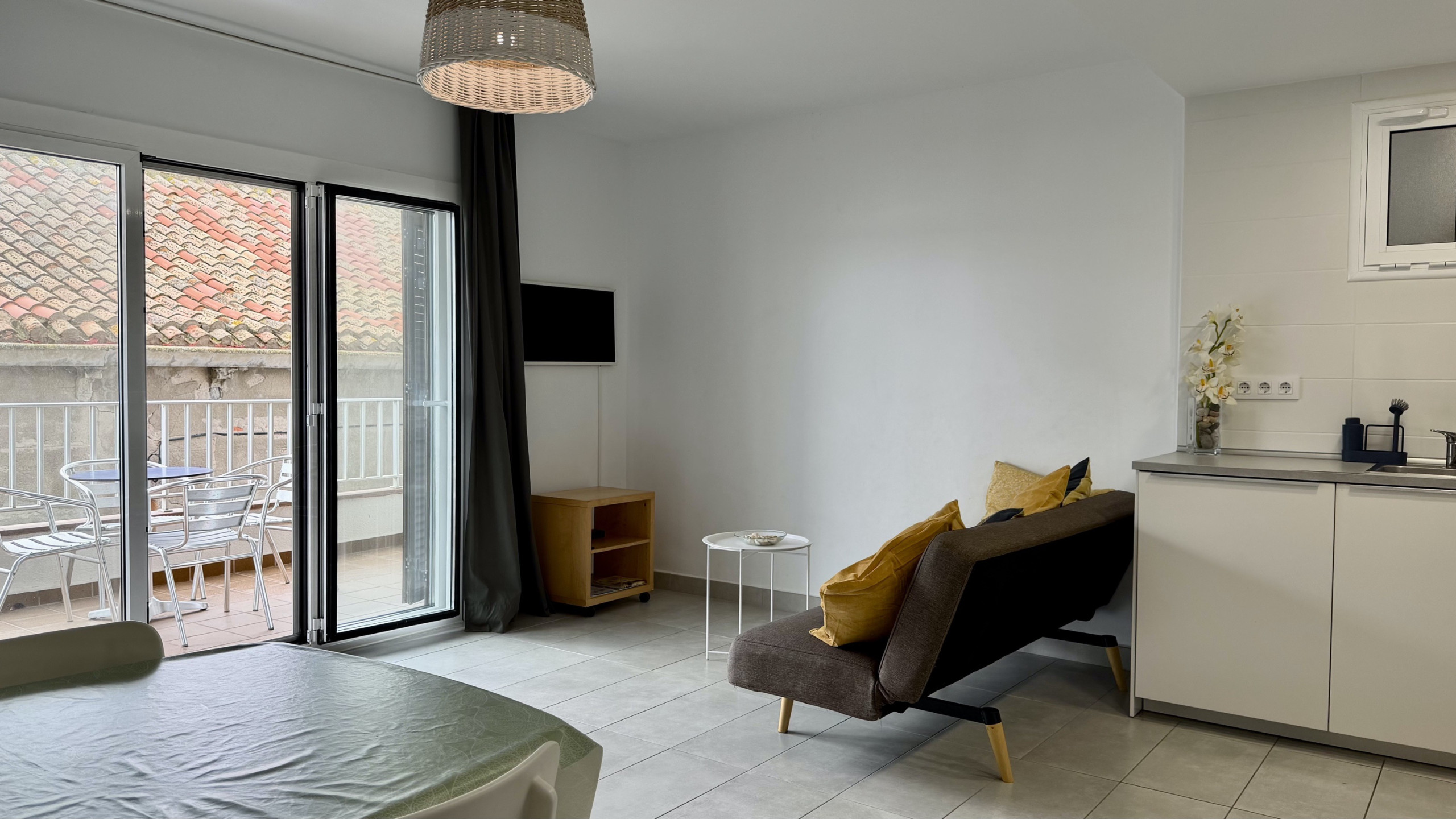 Außenbereich mit Terrasse und Gartenmöbeln zum Entspannen im Freien. WLAN-Verbindung verfügbar und Fernseher mit mehreren Sprachen zur Unterhaltung. Verfügt über ein Bügeleisen für Ihren Komfort.