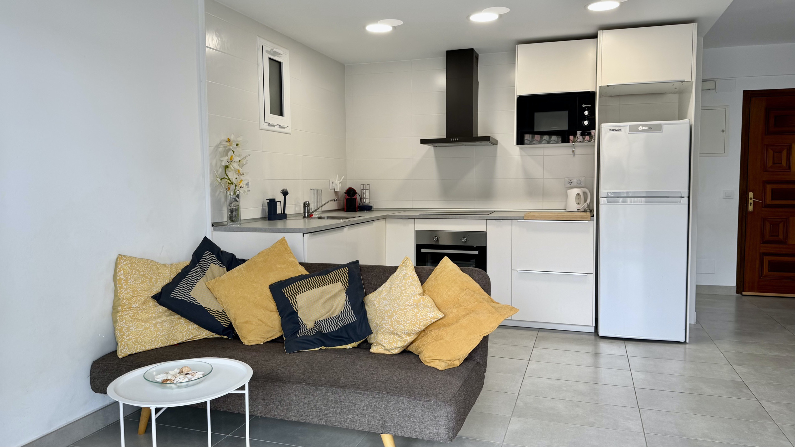 Die amerikanische Küche ist komplett ausgestattet mit modernen Haushaltsgeräten wie Kühlschrank, Waschmaschine, Kaffeemaschine, Geschirrspüler, Mikrowelle, Toaster und vollständigem Geschirr. Darüber hinaus verfügt sie über eine Glaskeramikkochplatte zum Zubereiten köstlicher Mahlzeiten.