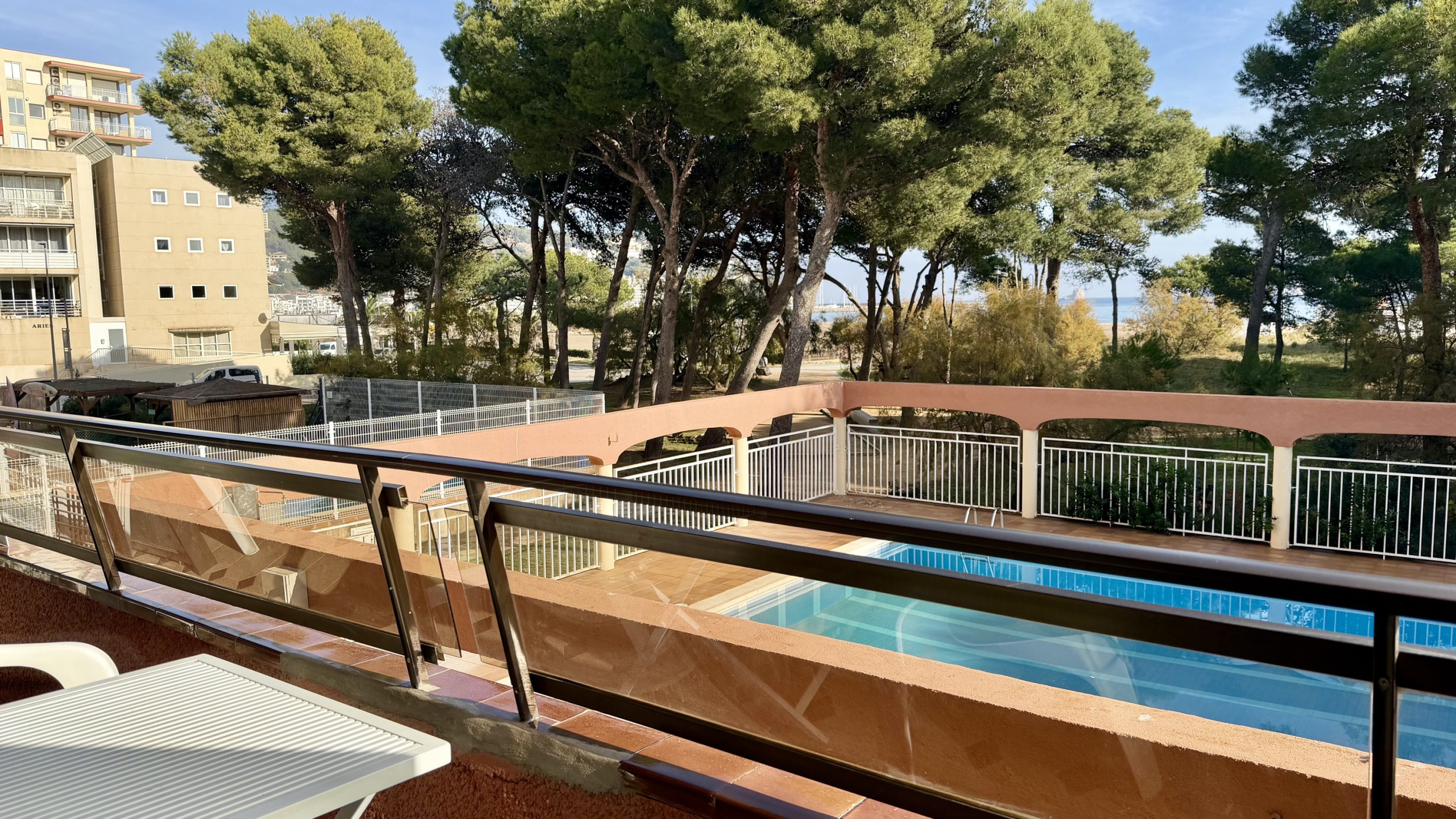 Het appartement beschikt over een terras dat je unieke momenten in de buitenlucht laat genieten, aangevuld met een gedeeld zwembad waar je kunt ontspannen en afkoelen tijdens de warmste dagen. De buitenruimte is een perfect plekje om van het uitzicht te genieten en te zonnen.