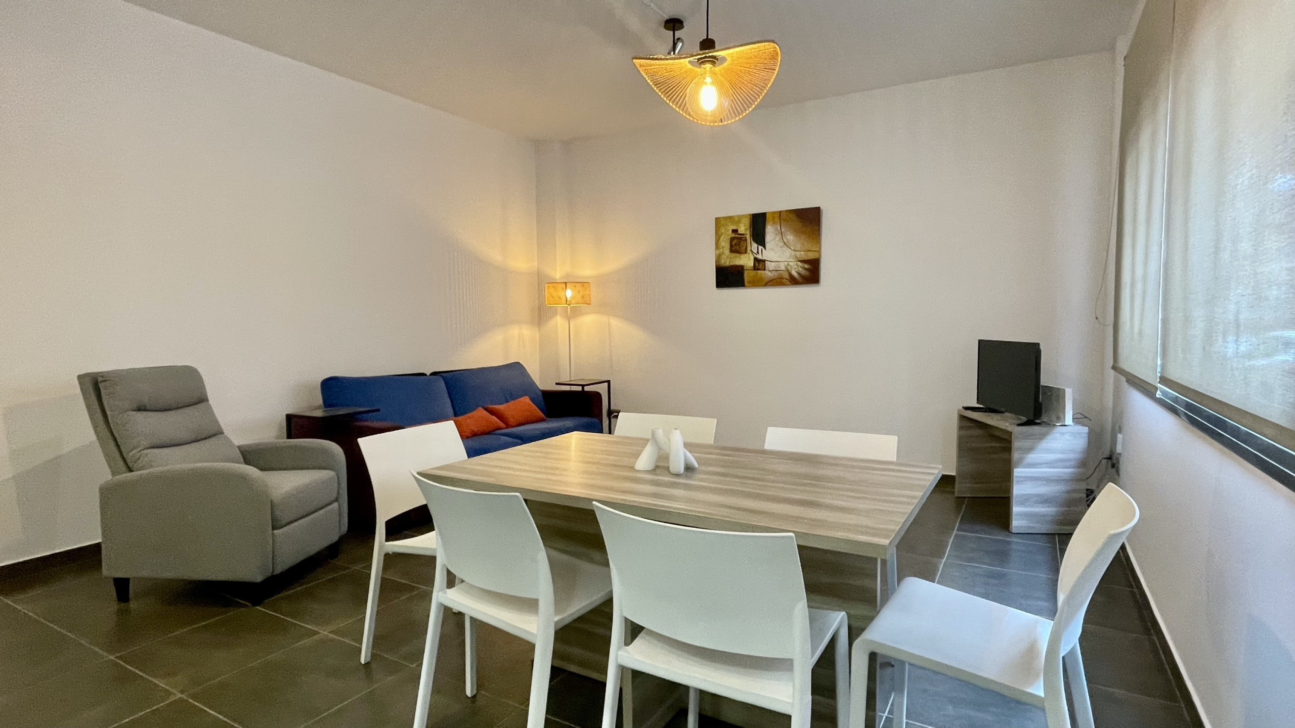 In the Rocamaura complex, this 1-bedroom apartment is available for vacation rental, featuring a double bunk bed and a single bed, accommodating up to 3 people. It includes a living-dining room with a sofa and TV, a small independent kitchen, and a bathroom with a shower.