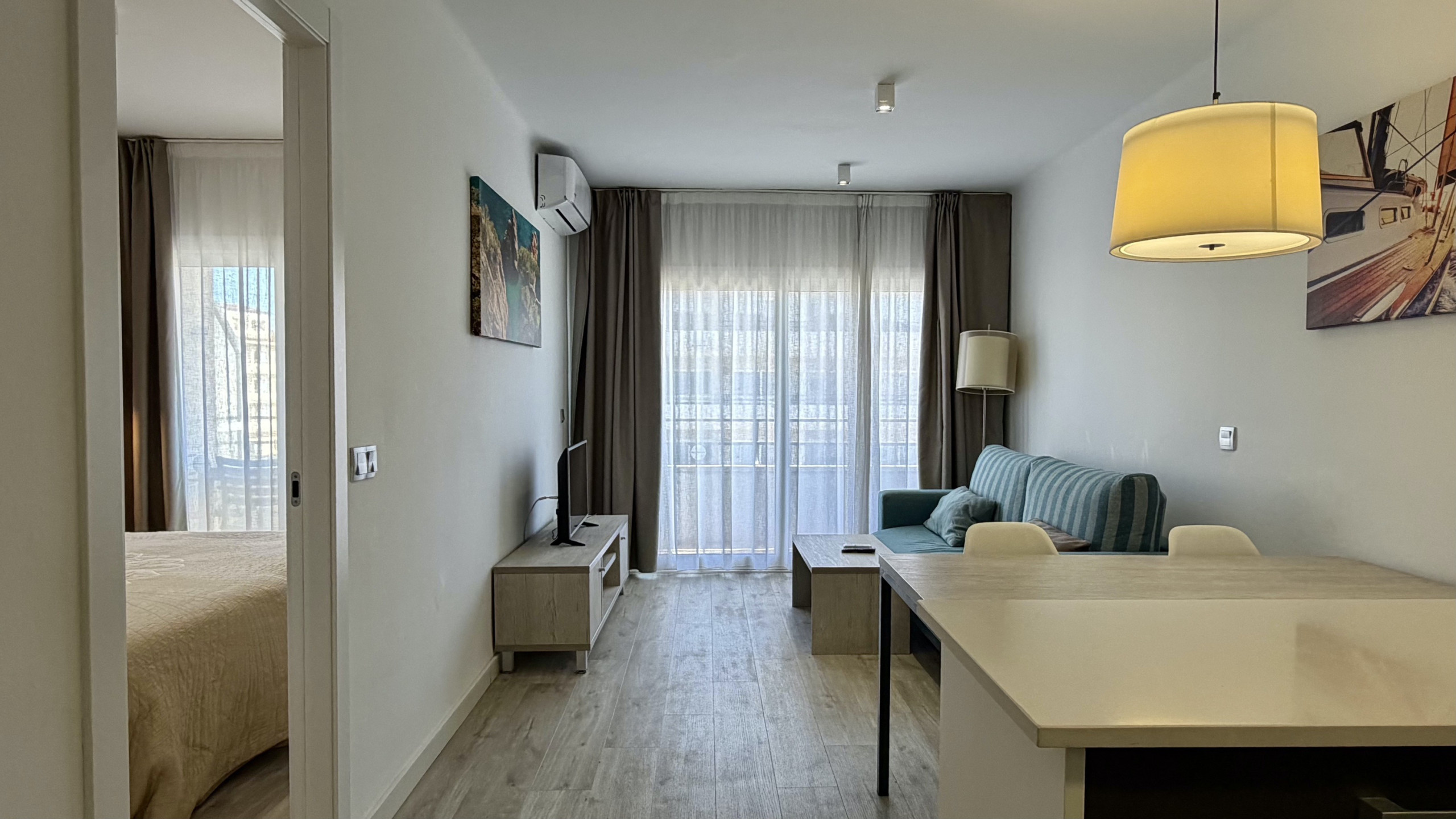 In the Rocamaura complex, this 1-bedroom apartment is available for vacation rental, featuring a double bunk bed and a single bed, accommodating up to 3 people. It includes a living-dining room with a sofa and TV, a small independent kitchen, and a bathroom with a shower.