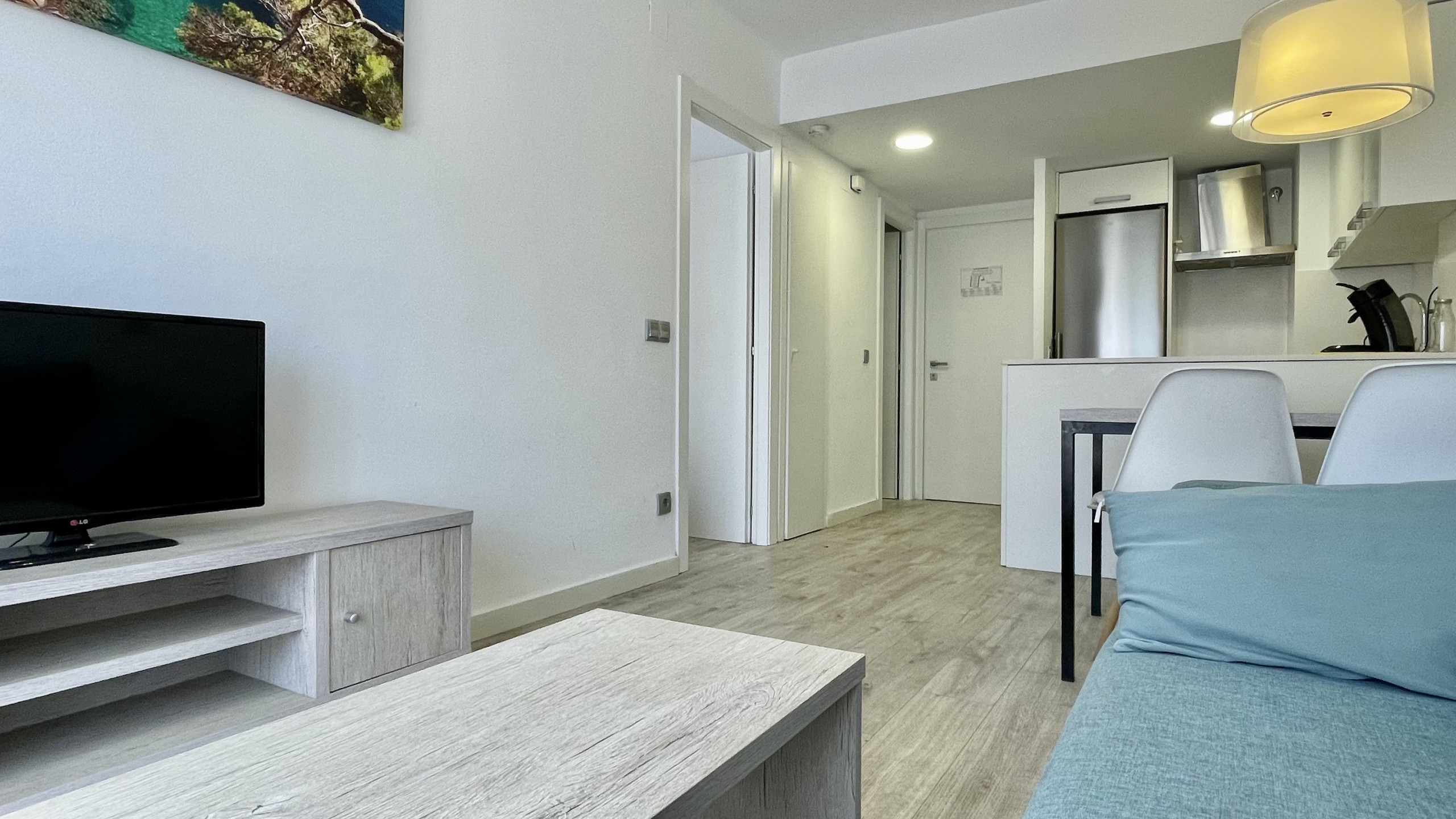In the Rocamaura complex, this 1-bedroom apartment is available for vacation rental, featuring a double bunk bed and a single bed, accommodating up to 3 people. It includes a living-dining room with a sofa and TV, a small independent kitchen, and a bathroom with a shower.
