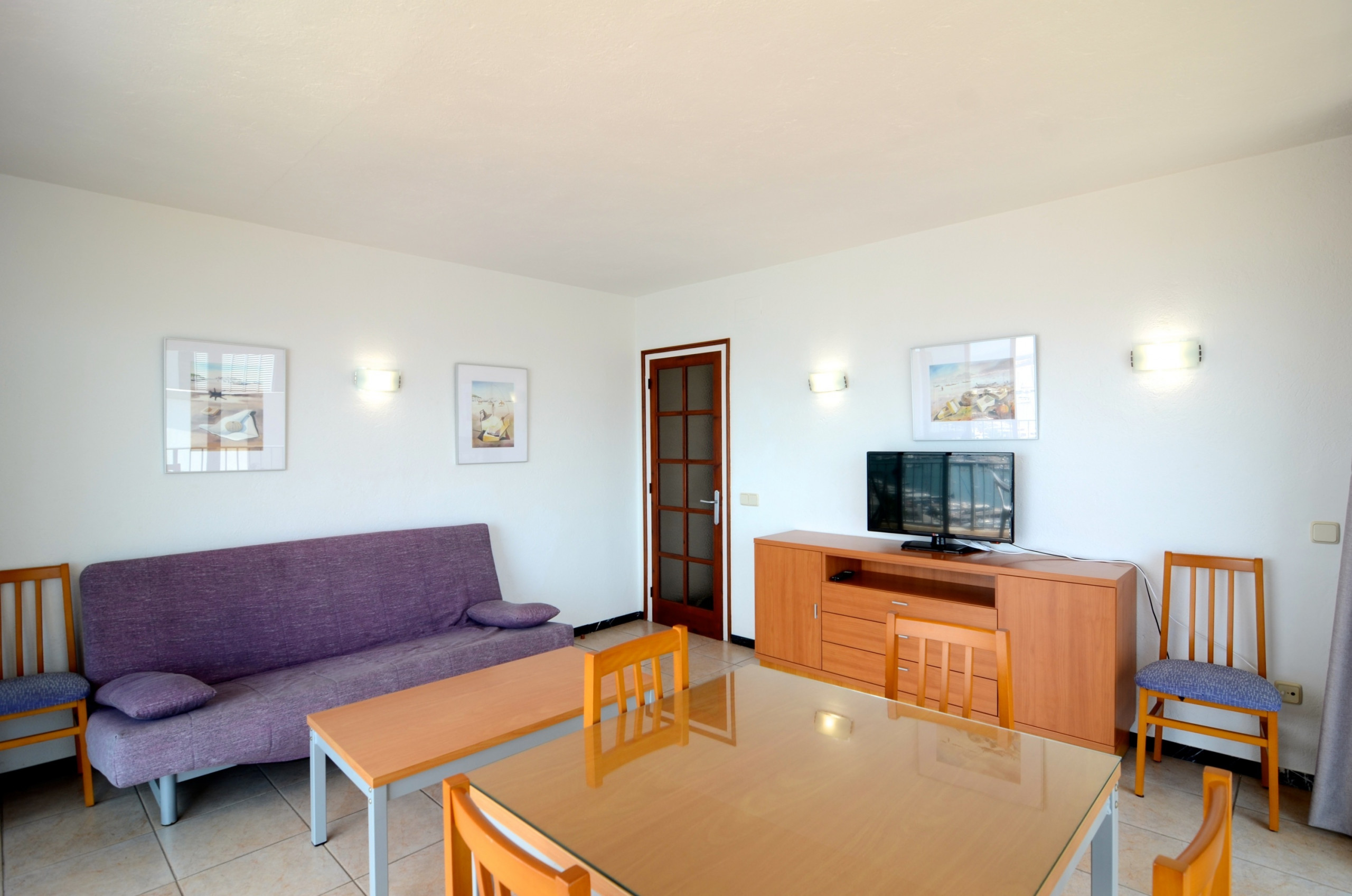 In the Rocamaura complex, this 1-bedroom apartment is available for vacation rental, featuring a double bunk bed and a single bed, accommodating up to 3 people. It includes a living-dining room with a sofa and TV, a small independent kitchen, and a bathroom with a shower.