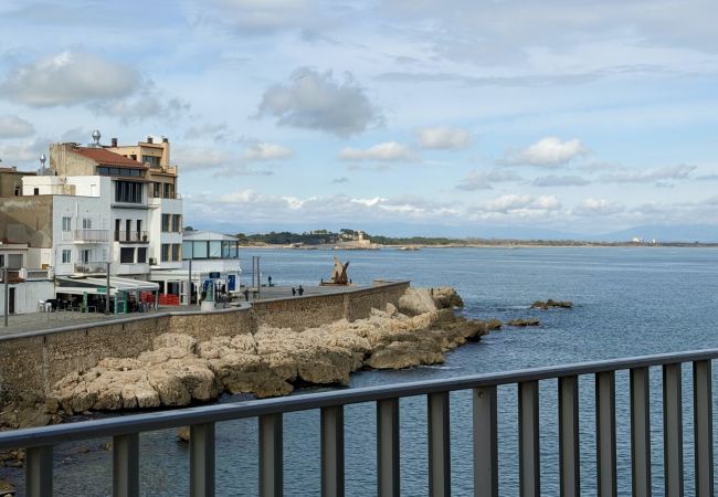 Belle situation de l'appartement avec terrasse et fenêtre d'une des chambres donnant sur la plage, mais bruit incessant dans la courette (près de chambre parents).