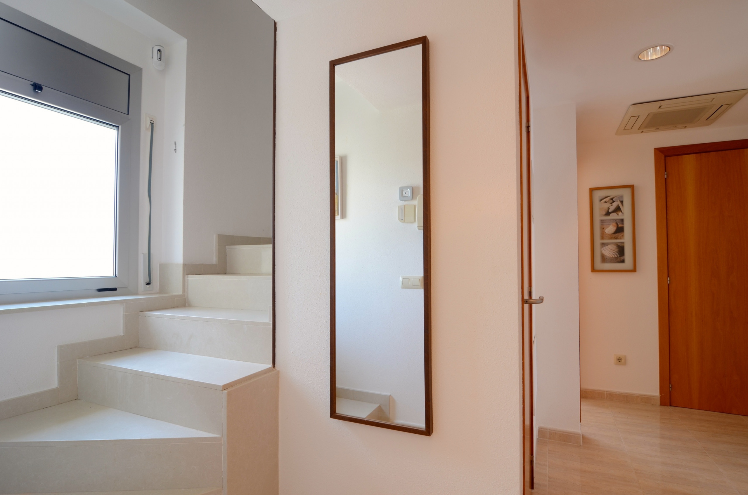 L'étage supérieur abrite la zone sociale, comprenant un salon lumineux, une salle à manger et une cuisine entièrement équipée, tous intégrés dans un même espace. Également à cet étage, il y a des toilettes supplémentaires et une grande terrasse offrant une vue imprenable sur la montagne Rocamaura et des vues latérales sur la mer.