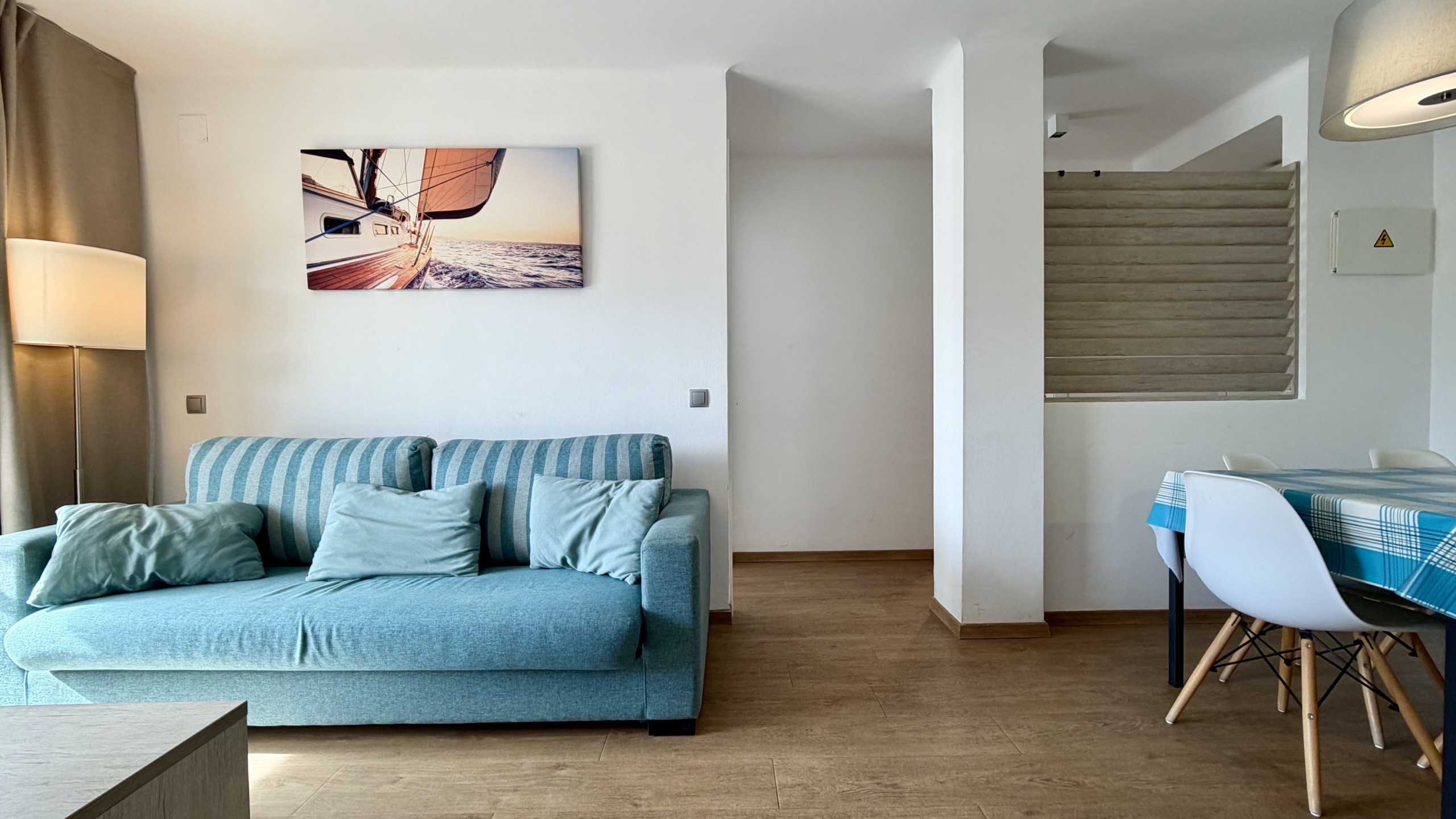 Dans le complexe Rocamaura, cet appartement d'une chambre est disponible à la location pour les vacances, avec un lit superposé double et un lit simple pouvant accueillir jusqu'à 3 personnes. Il comprend un salon-salle à manger avec un canapé et une télévision, une petite cuisine indépendante et une salle de bains avec douche.