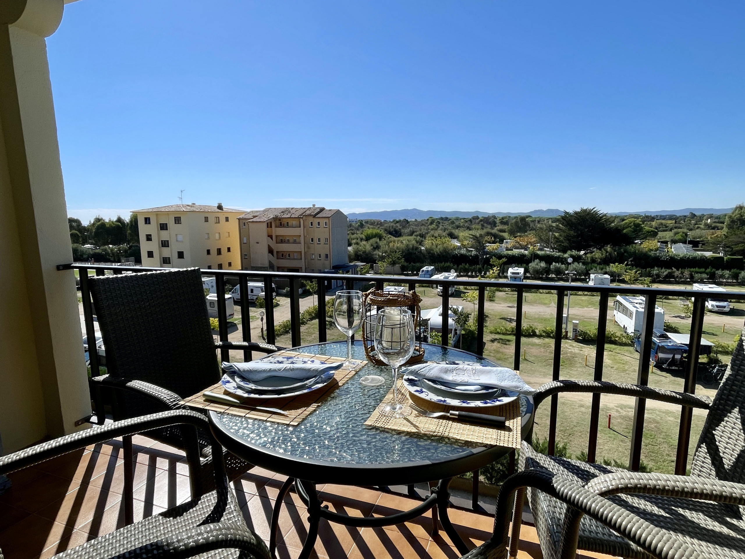 L'appartement dispose d'une grande terrasse avec une vue imprenable sur l'ensemble du complexe Rocamaura, avec la piscine à vos pieds et les îles Medes en arrière-plan.