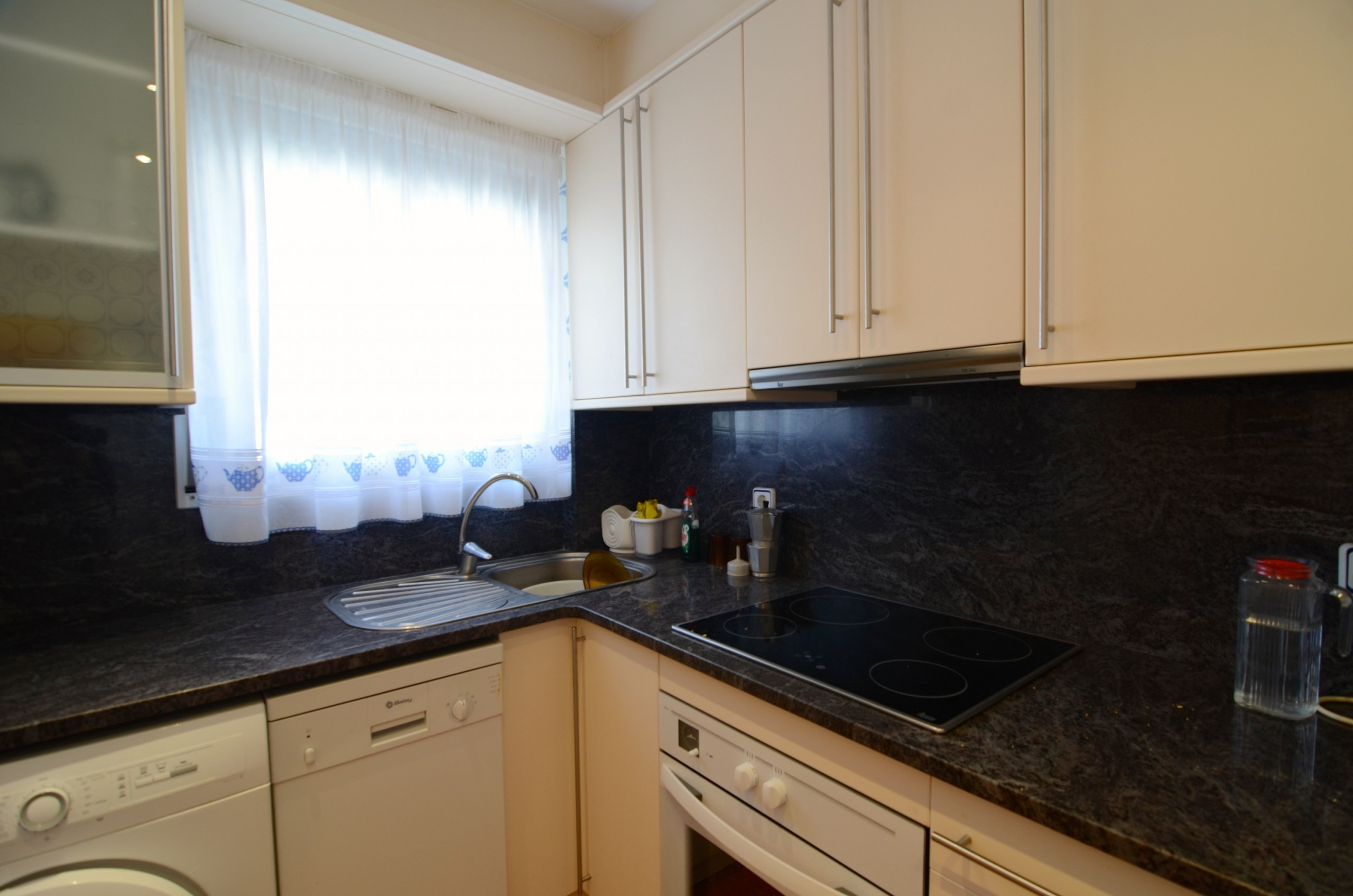 La cuisine séparée, équipée d'une plaque vitrocéramique, comprend un réfrigérateur, un micro-ondes, un four, un congélateur, un lave-vaisselle, de la vaisselle/couverts, des ustensiles de cuisine, une cafetière et un grille-pain pour votre confort culinaire.