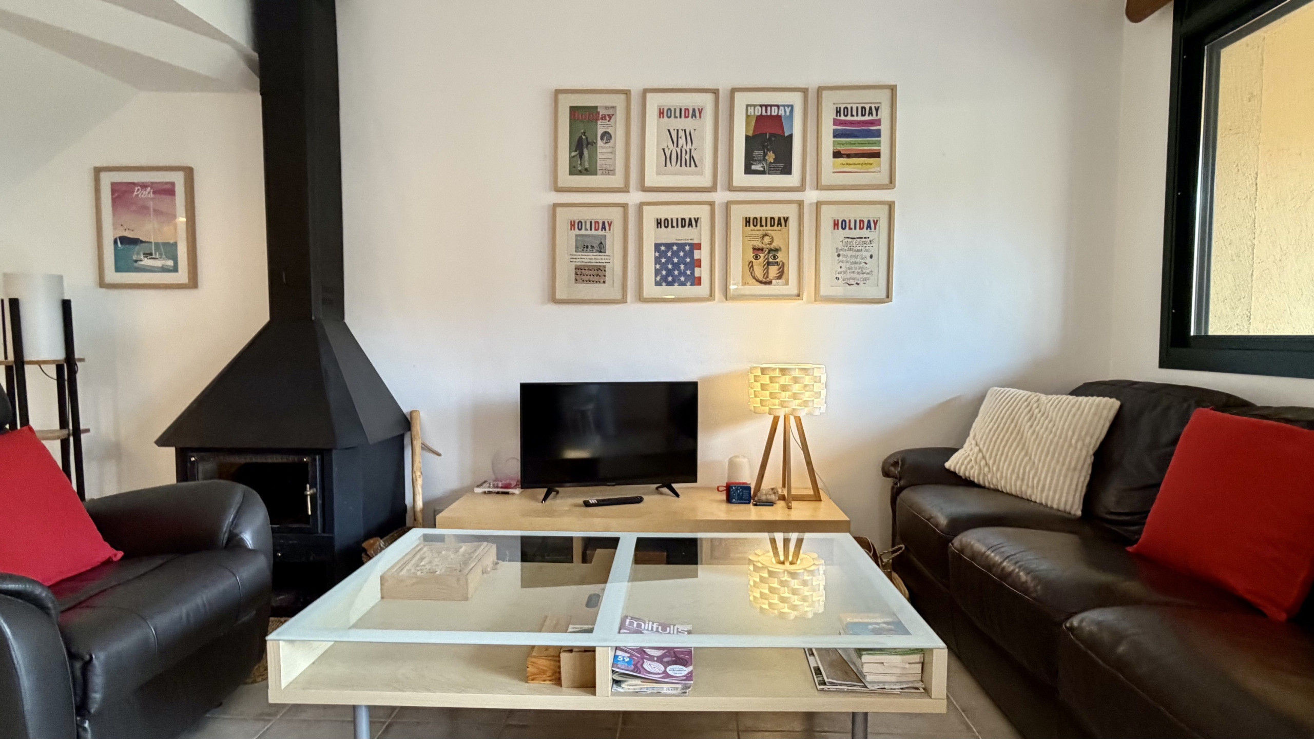 L'intérieur se distingue par sa fonctionnalité et son confort. La cuisine américaine est entièrement équipée d'appareils de dernière génération, comprenant un réfrigérateur, un four, un micro-ondes, un lave-vaisselle et une machine à café. De plus, elle dispose d'une cheminée pour les soirées plus fraîches, d'un fer à repasser et de deux téléviseurs pour le divertissement familial. Elle ne dispose pas de machine à laver.
